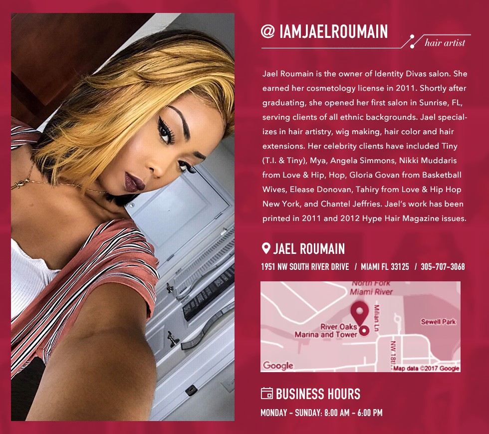 Jael Roumain is the owner of Identity Divas salon. She earned her cosmetology license in 2011. Shortly after graduating, she opened her first salon in Sunrise, FL, serving clients of all ethnic backgrounds. Jael specializes in hair artistry, wig making, hair color and hair extensions. Her celebrity clients have included Tiny (T.I. & Tiny), Mya, Angela Simmons, Nikki Muddaris from Love & Hip, Hop, Gloria Govan from Basketball Wives, Elease Donovan, Tahiry from Love & Hip Hop New York, and Chantel Jeffries. Jael’s work has been printed in 2011 and 2012 Hype Hair Magazine issues.