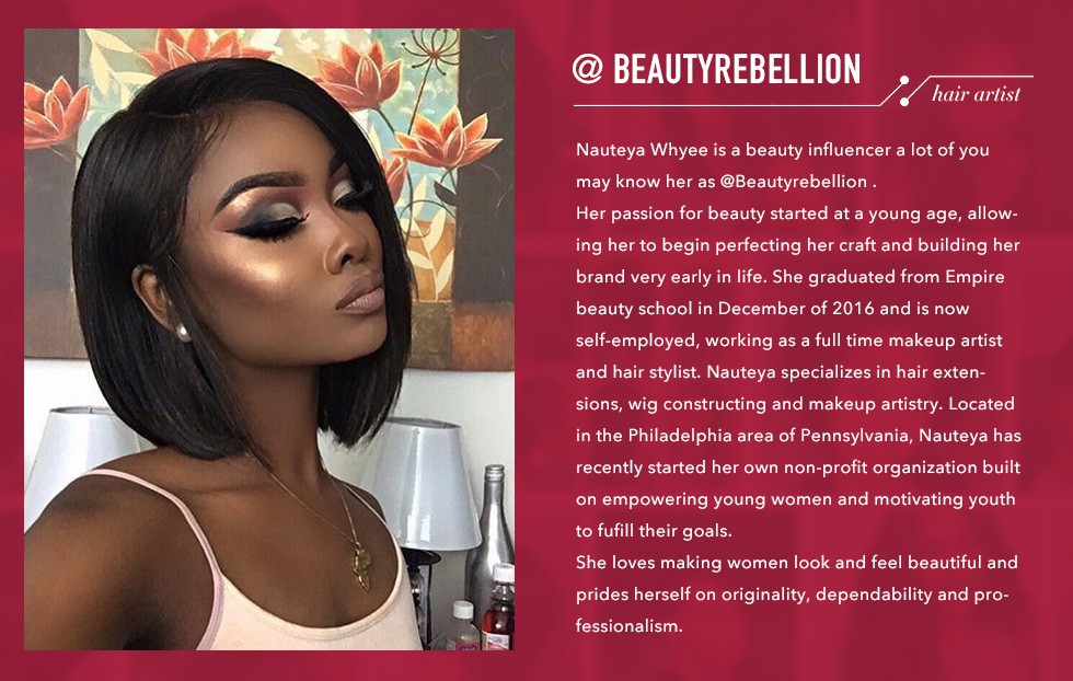 Nauteya specializes in hair extensions, wig constructing and makeup artistry. Located in the Philadelphia area of Pennsylvania, Nauteya has recently started her own non-profit organization built on empowering young women and motivating youth to fufill their goals. She loves making women look and feel beautiful and prides herself on originality, dependability and professionalism.